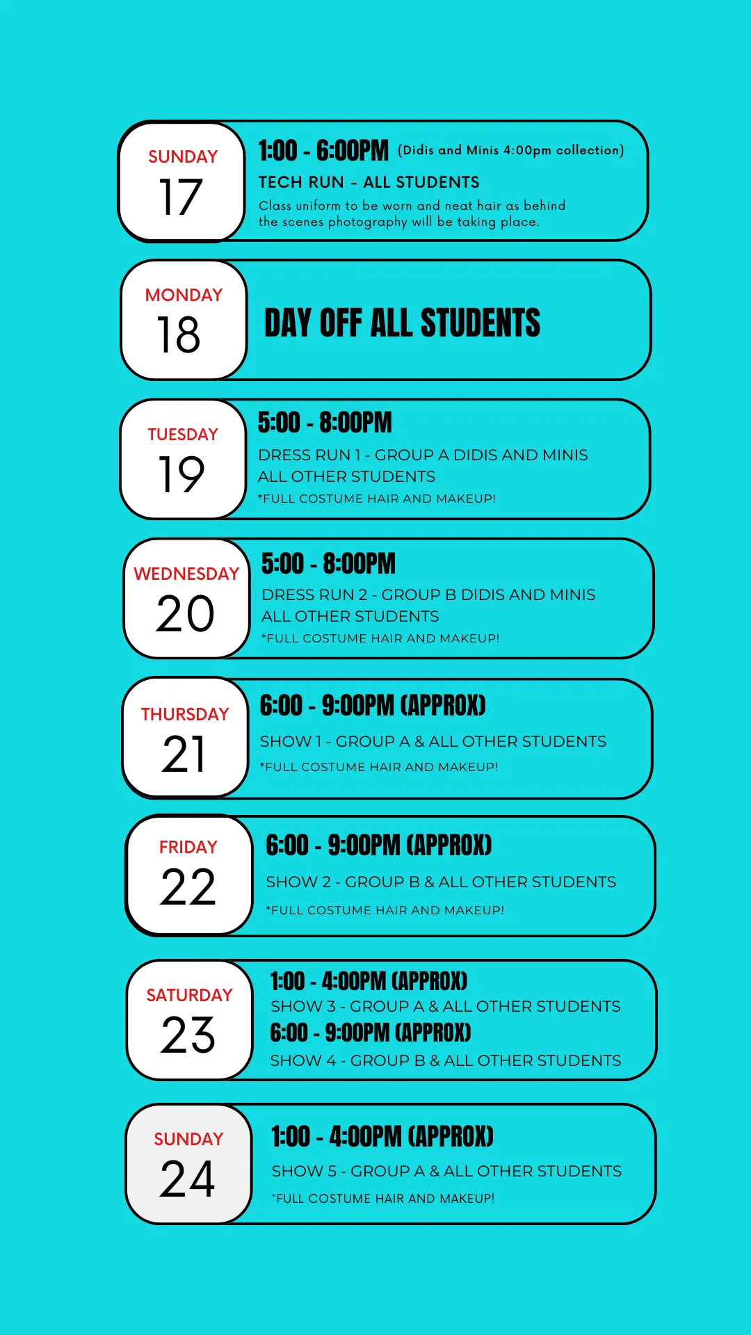 Please note: these are rehearsal/call times, not performance start times.
