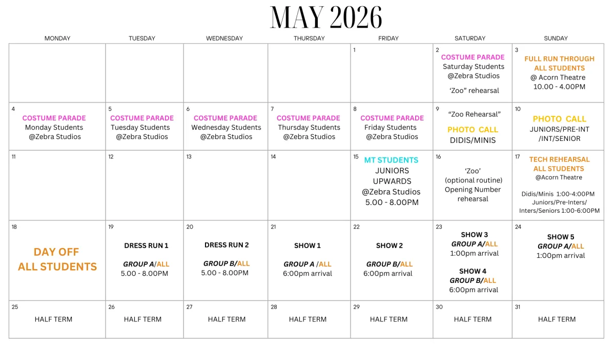 All students must also have a show T-shirt: £11 (children’s sizes) and £13 (adult sizes).