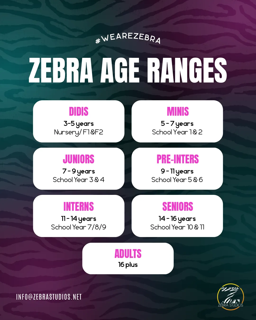 Students are grouped into show categories (Didis, Minis, Juniors, Pre-Inters, Inters, Seniors) based on age/school year. Check the Age Categories section on this page, and if you’re unsure, get in touch before signing up.